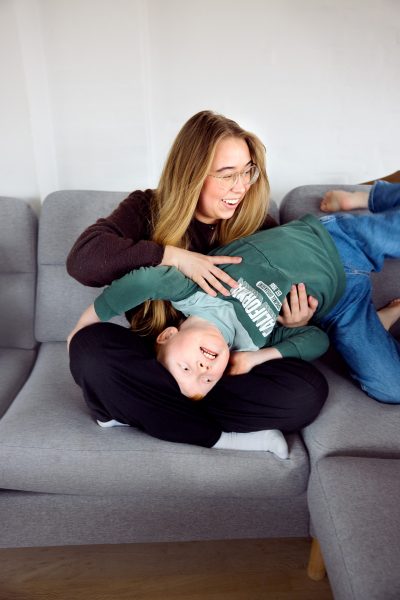 “Vores sagsbehandler i Haderslev Kommune kunne godt se, at vi var ekstremt pressede, og at der skulle gøres noget nu,” forklarer Brian. Udover at Brian går hjemme, så han kan overskue at stå med Jeppe om aftenen og natten, har familien derudover fået bevilliget ni månedlige afløsningstimer på en DUOS-ordning, som siden er blevet sat op til 12 timer. I de 12 timer får Jeppe besøg af Anne Sofie, som er en sygeplejestuderende, der bor lidt uden for Haderslev.