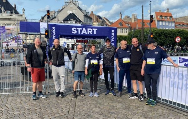 På billedet her ses Rene (længst til venstre) sammen med hans DUOS-hjælpere Mads og Claus, Renes mor Jannie, Jannies kollega, Renes far Flemming, DUOS-hjælper Kenneth og Renes psykolog Leif til Royal Run 2025.